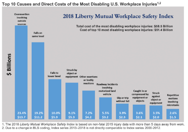The second most common injury type is slip, trips, and falls. Liberty Mutual’s Workplace Safety Index and Helpside reports these injuries account for 33.1% (combining falls on the same level, falls to a different level and slips without a fall), and 16.3% respectively.